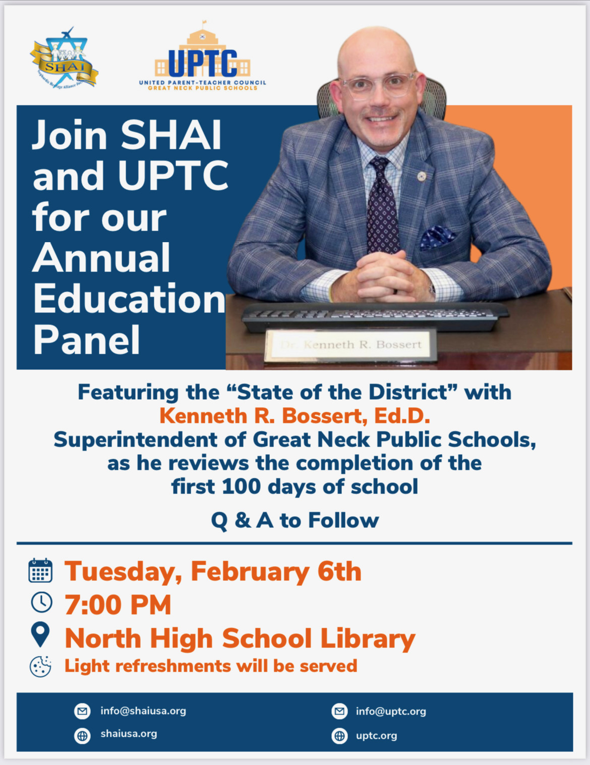 On February 6, 2024, SHAI and the Great Neck Public Schools United Parent Teacher Council (UPTC) hosted our annual educational forum at North High School, where Dr. Kenneth Bossert, new superintendent of schools, presented a review of his first 100 days in the district. He was very positive, animated, amiable, and knowledgeable. Dr. Bossert’s theme of the night was “Where discovery meets greatness.”